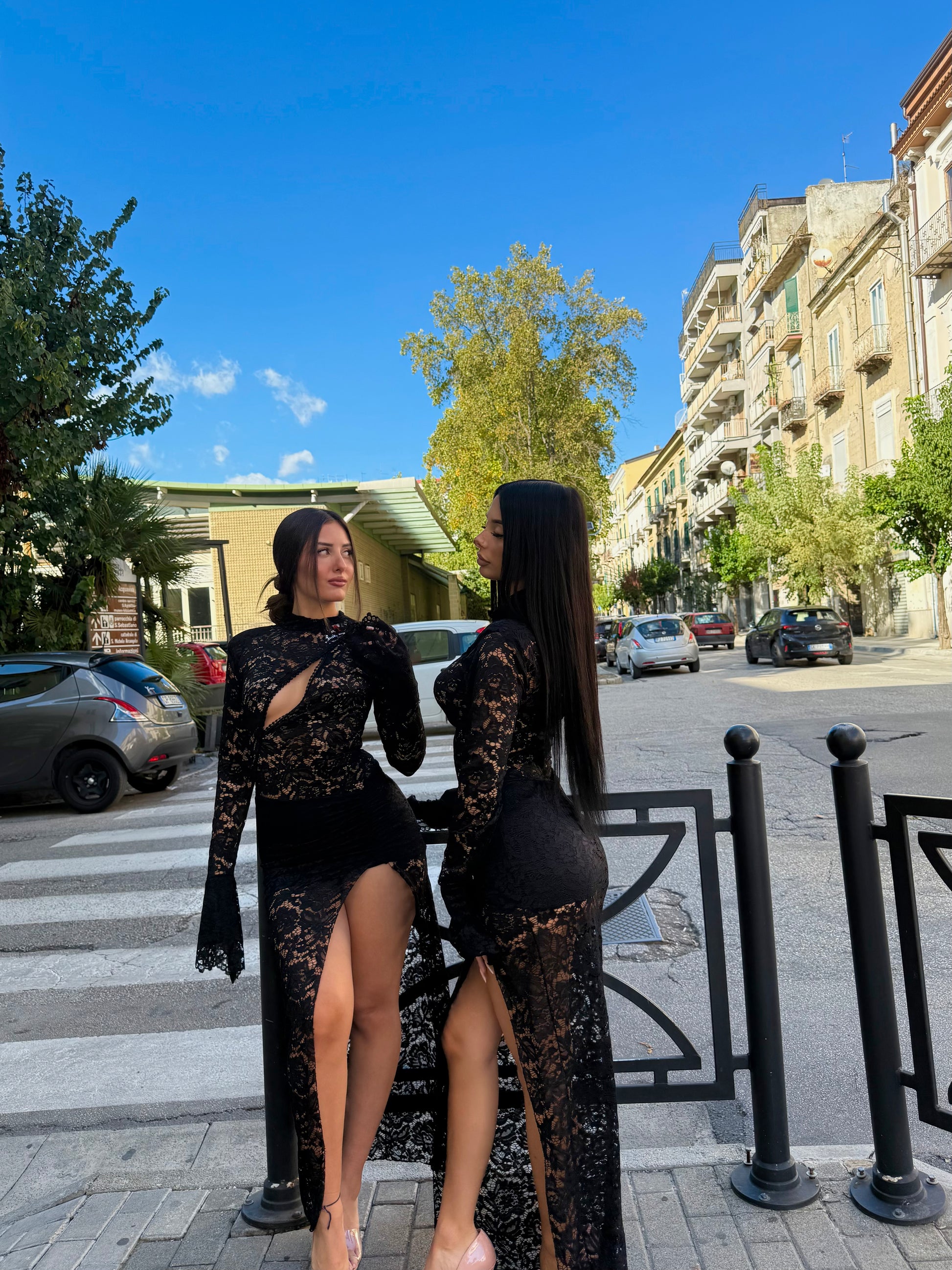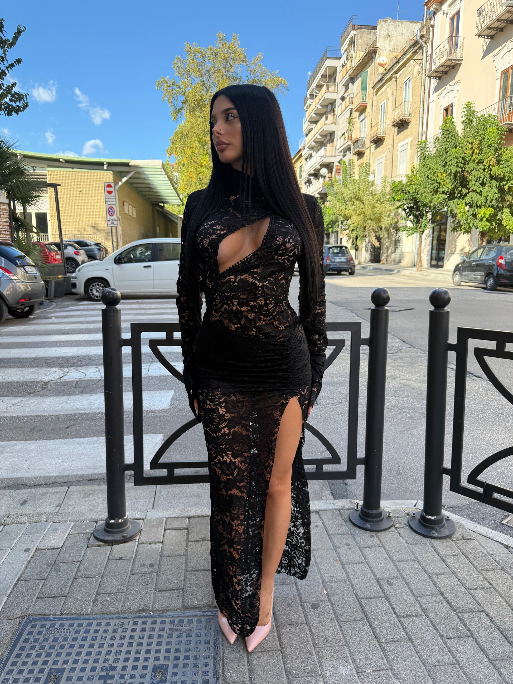 7181, abito lungo in pizzo con apertura sul d’avanti, taglia unica