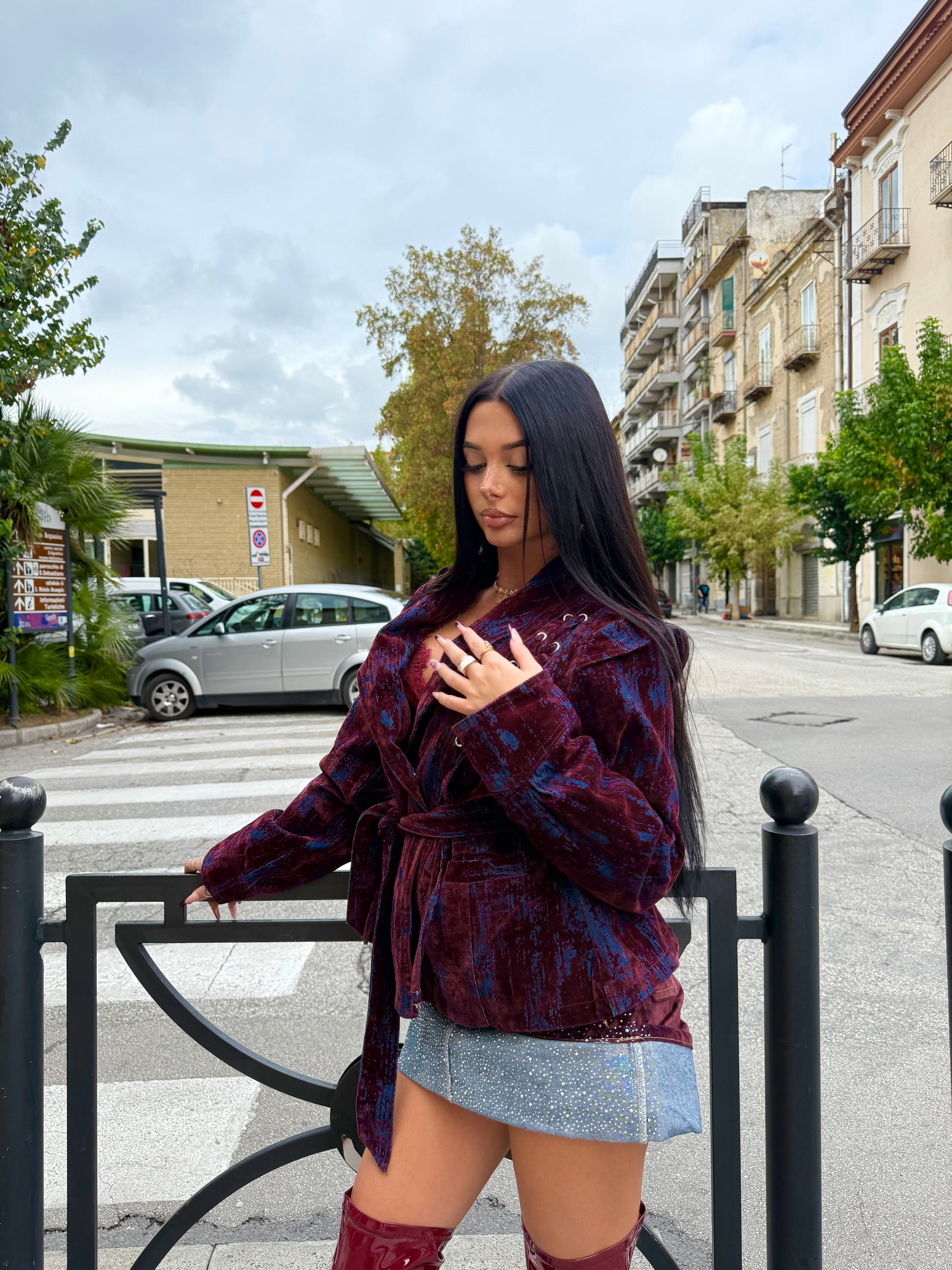 6637,giacca con cinta, tessuto in simil velluto, taglia unica