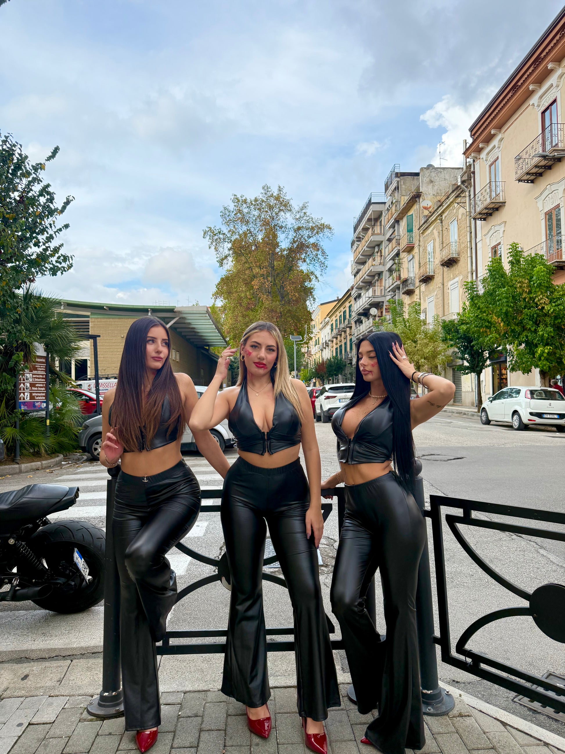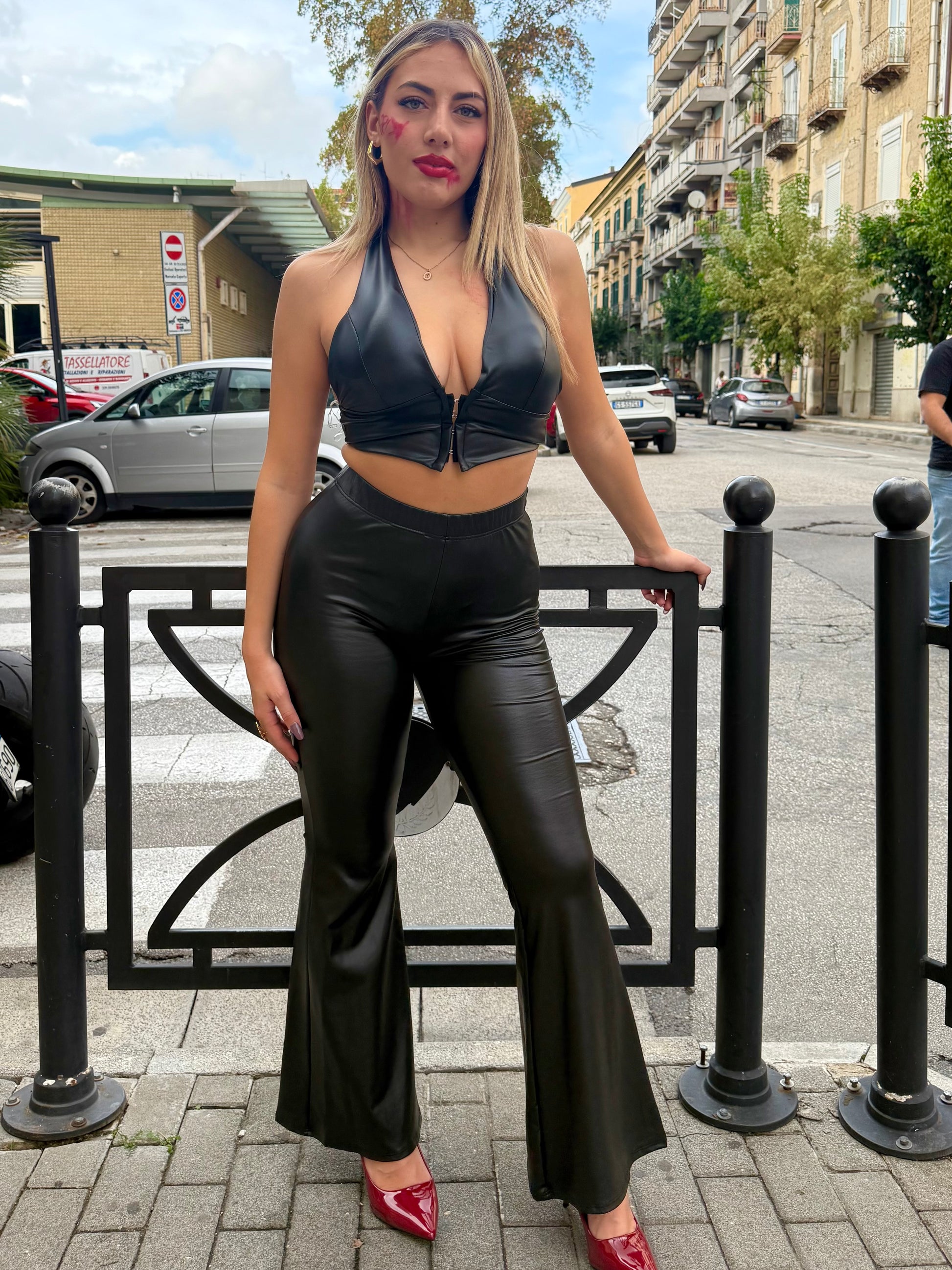 19382, coordinato in ecopelle composto da top e pantalone a gamba larga, taglia unica