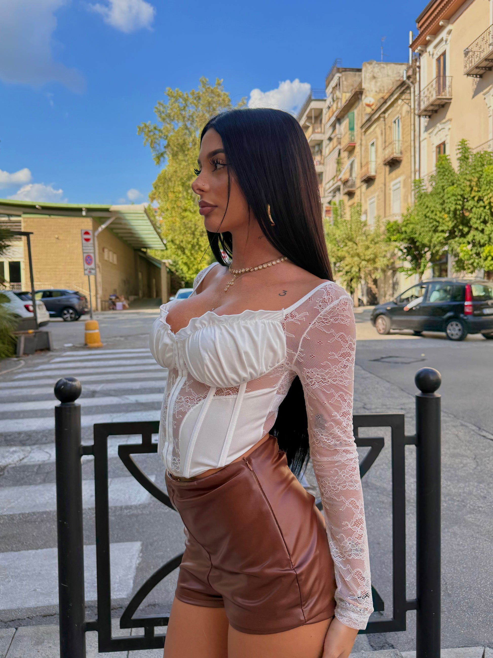 70304, top in pizzo con scollo a balconcino e apertura, taglia unica